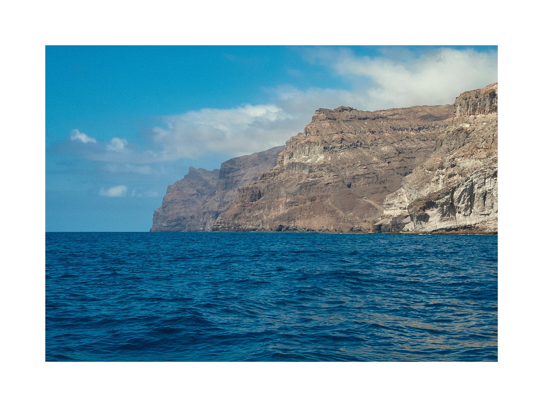 A quiet coastal encounter. This color photograph captures the raw geometry of volcanic cliffs against a vivid stretch of sea, where the weight of the land meets the movement of water. The framing is deliberate, holding space between distance and surface, light and depth — inviting the viewer into a moment both grounded and open-ended.