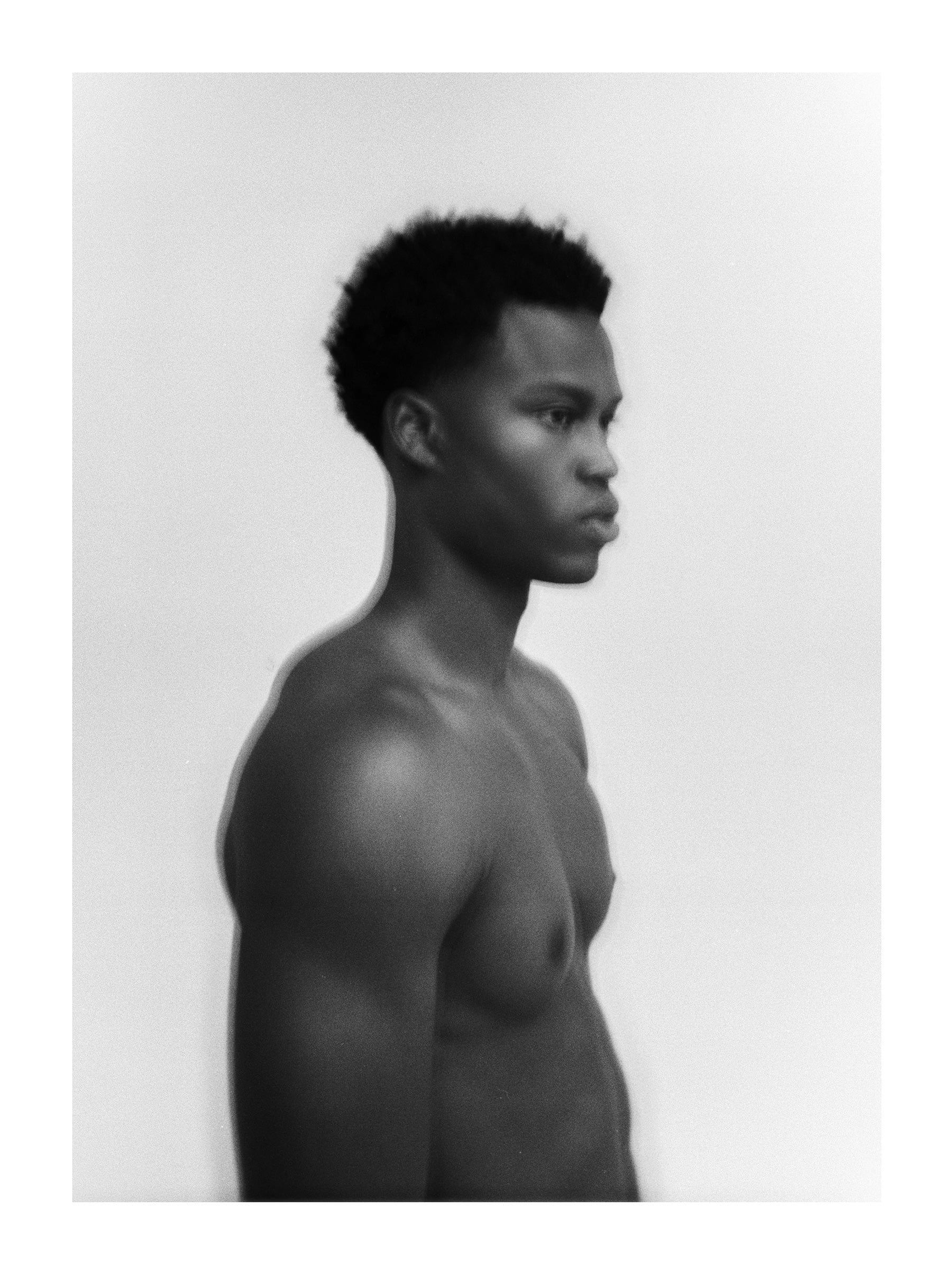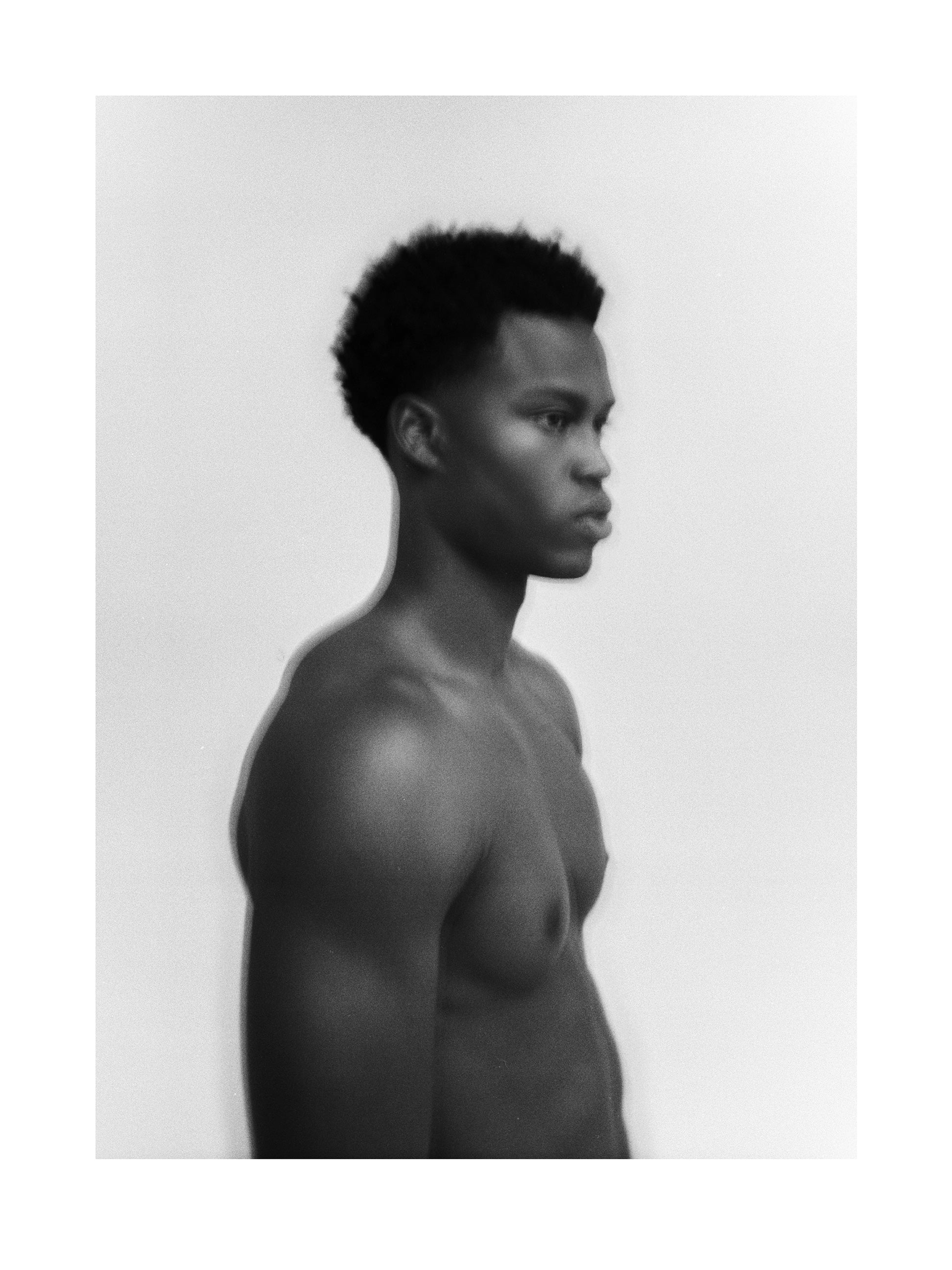 This black-and-white portrait presents the subject in soft, painterly focus against a minimalist background. The profile conveys a quiet command of space, balanced with openness and vulnerability. Gentle lighting and deliberate blur highlight form while allowing emotion to emerge naturally. The composition speaks to endurance, self-possession, and the subtle tension between strength and fragility.